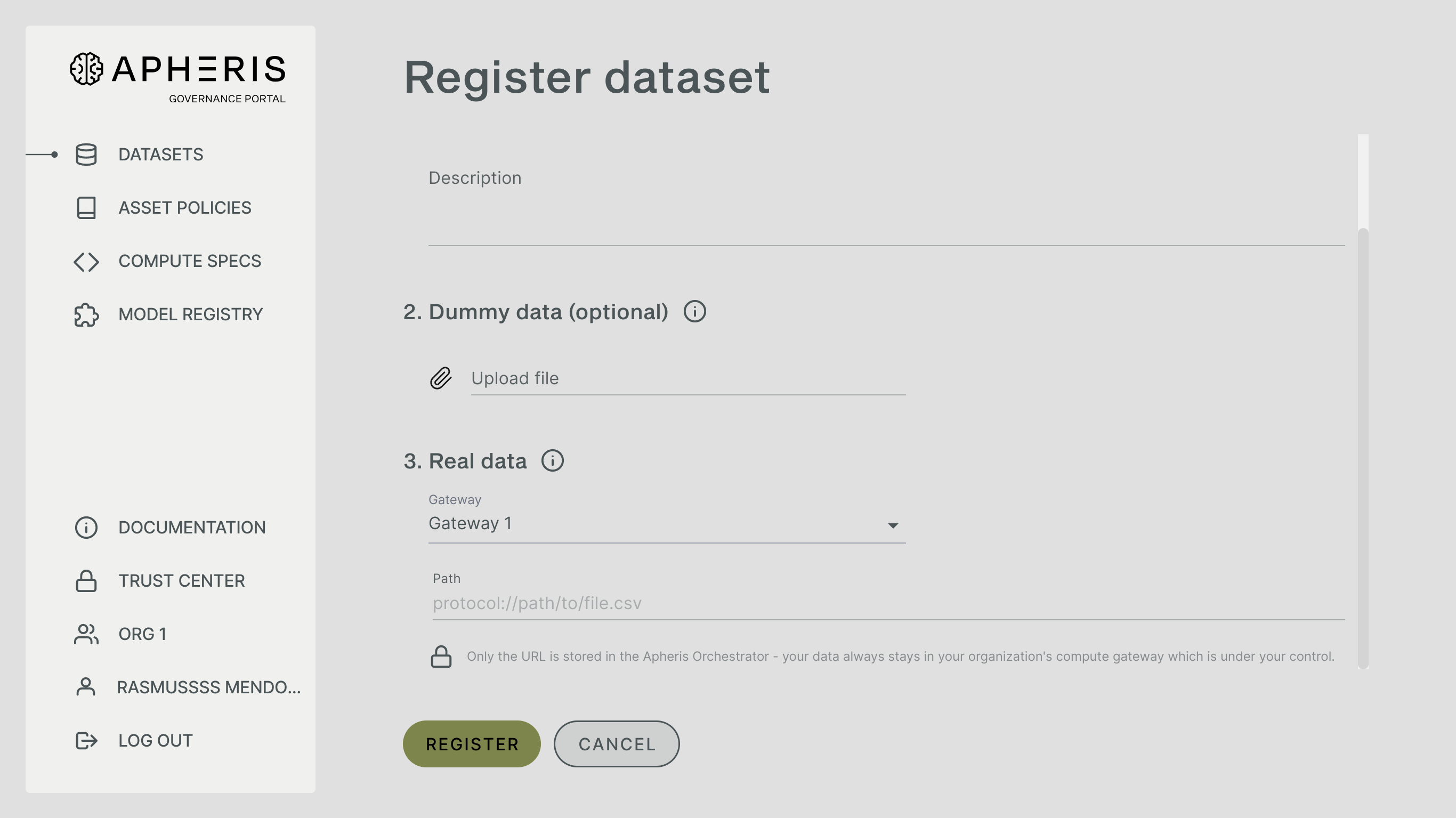 and fill out the relevant fields on the registration form. Please note, that real data is never uploaded. You only have to specify a path to the dataset within your environment.