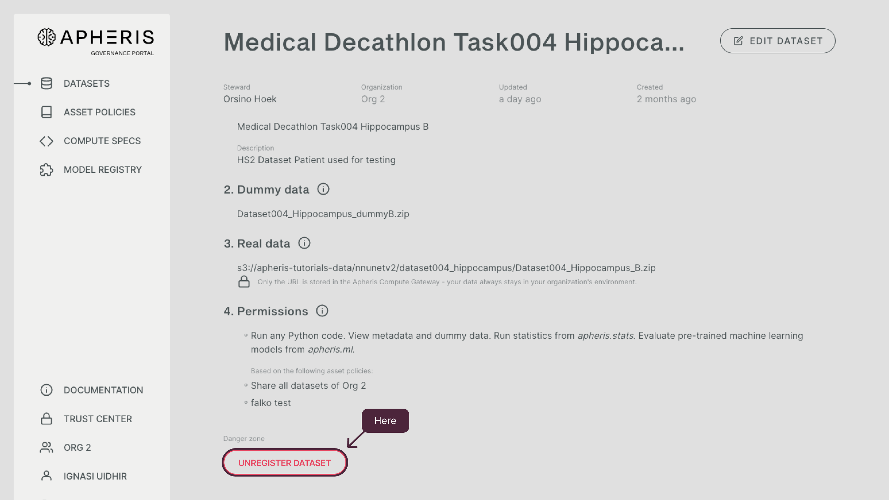 If you have an Owner role you can unregister any dataset within your organization. If you have a Data Steward role, you can only unregister the datasets you registered yourself.
