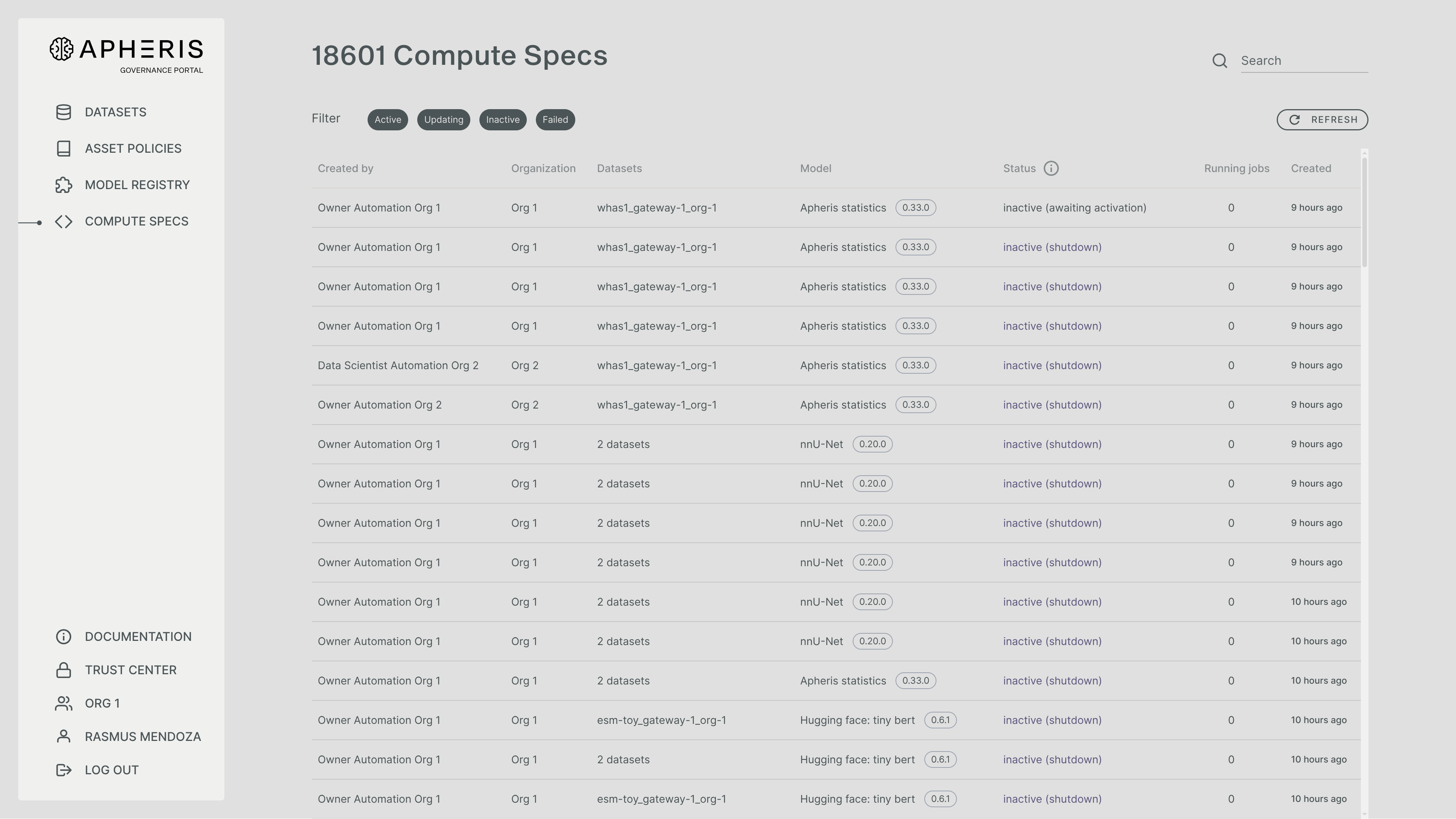 Here you can see a table of Compute Specs, together with the information by whom the Compute Spec was created and which organization they are from, as well as the datasets and model that they requested to use.