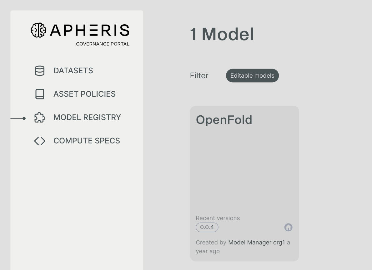 Please communicate the information specified in the previous section (repository_name, quay_tag, and digest) to your Apheris representative. As soon as Apheris adds the model to the Model Registry the new version of the model will then appear on the platform and can be treated like any other model.