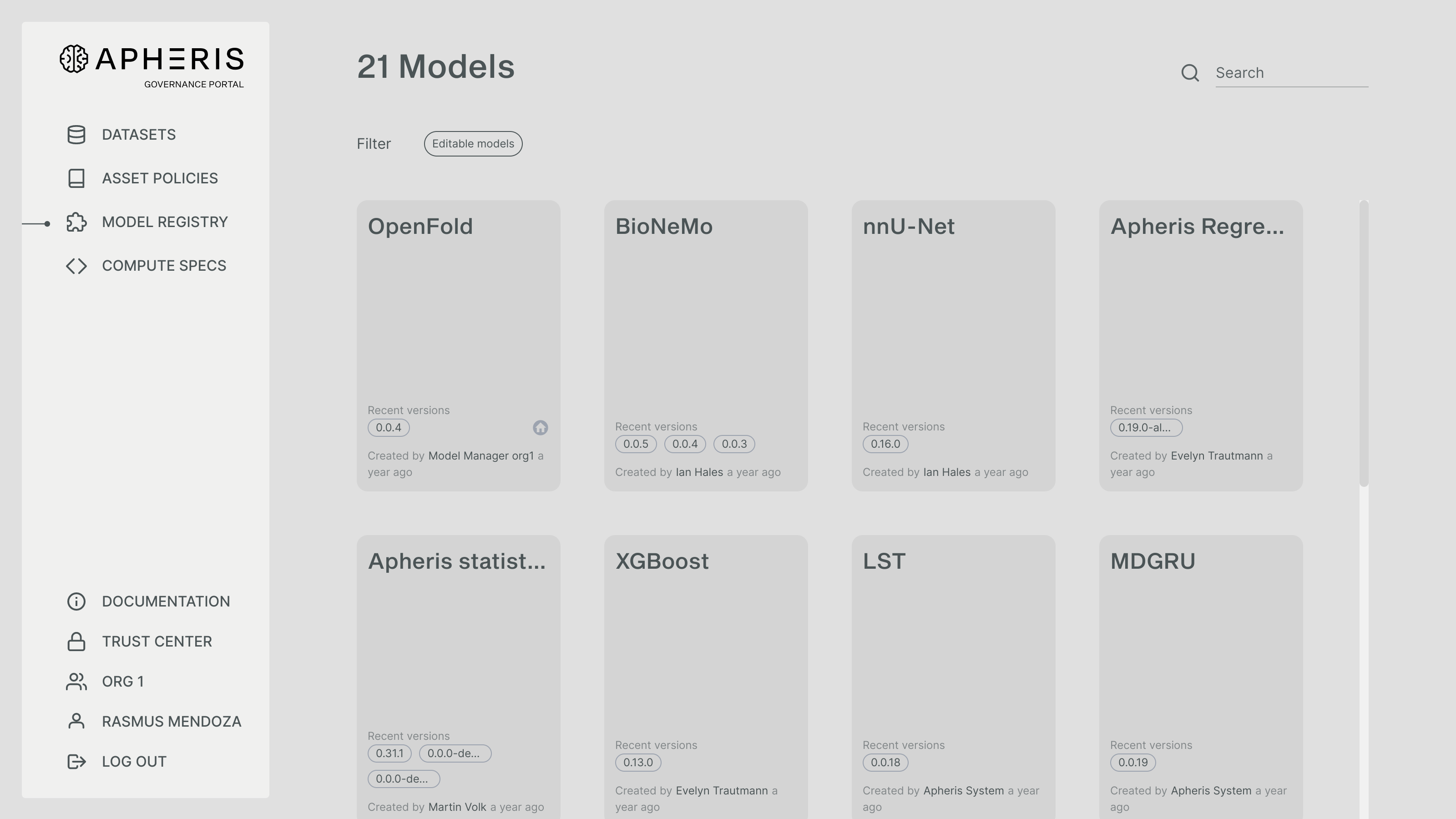 When you start your journey on the Apheris platform, your Model Registry is pre-populated with Apheris-defined models. It is furthermore possible to build your own customized models for your collaborators and yourself. You can learn more about creating custom models in the next chapter.