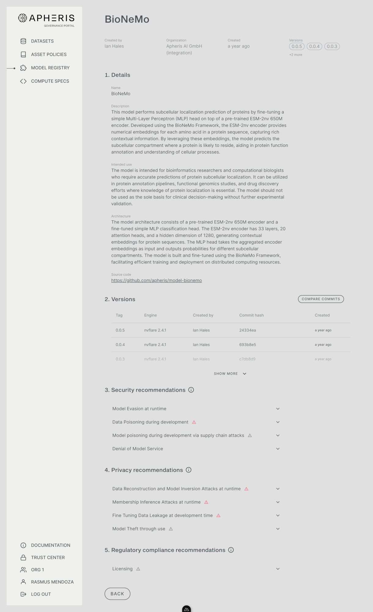 - the ability to compare the source code of different versions (please contact your Apheris representative if you do not have access to the model's source code repository);