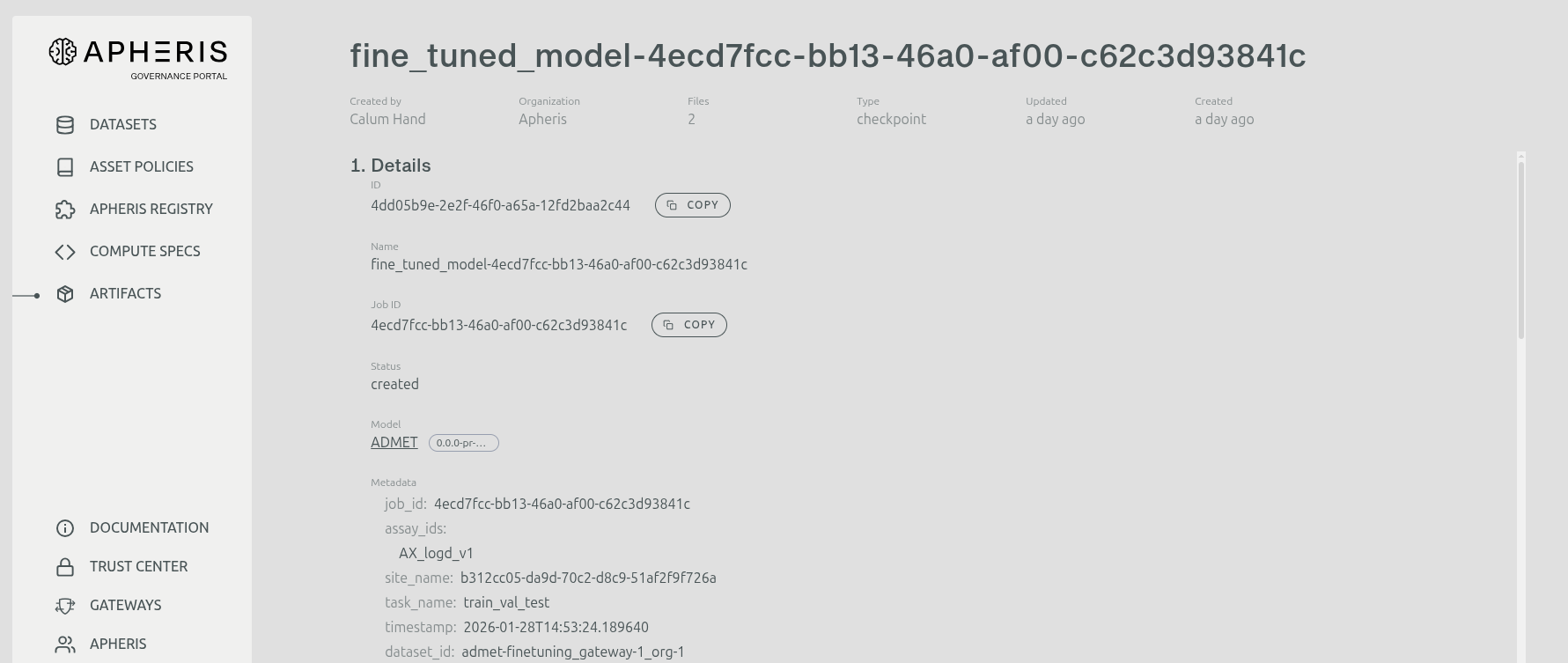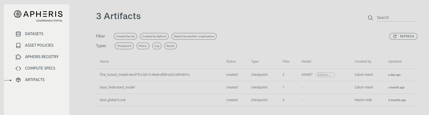 Use the Apheris Governance Portal to browse, filter, and download artifacts you can access (owned or shared).