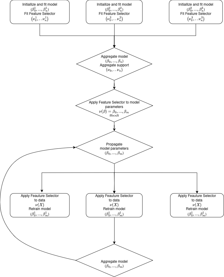 To solve this we train the logistic regression model in the first round on the full feature set. The support vector of the feature selector is aligned over the clients by majority vote. This happens only in the first aggregation round and once this is done, the regression coefficients model parameter is transformed in the same way as the training data. From the second round on the local training rounds are only trained on the selected features and the feature selector remains frozen. The training flow with feature selection is illustrated in the figure below.