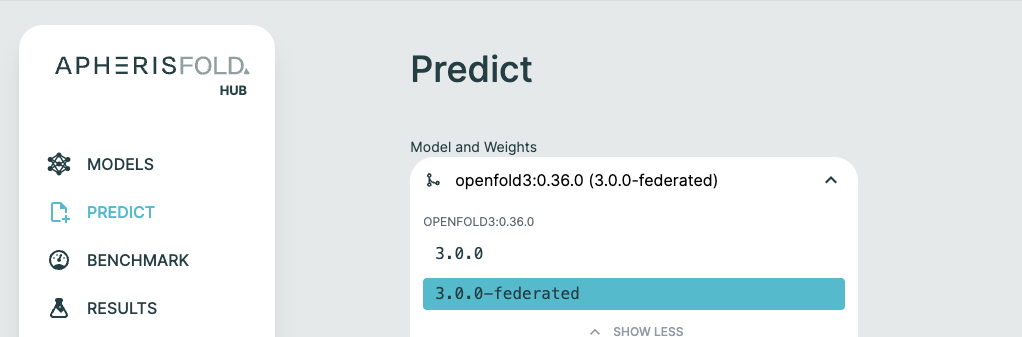 The Apheris Hub works with multiple models (currently OpenFold3 and Boltz-2) for the ApherisFold application. These models have been packaged by Apheris as Docker images and can be deployed in your environment. They come with a standardized query payload and can be called via an HTTP API. See Running Prediction for more information.
