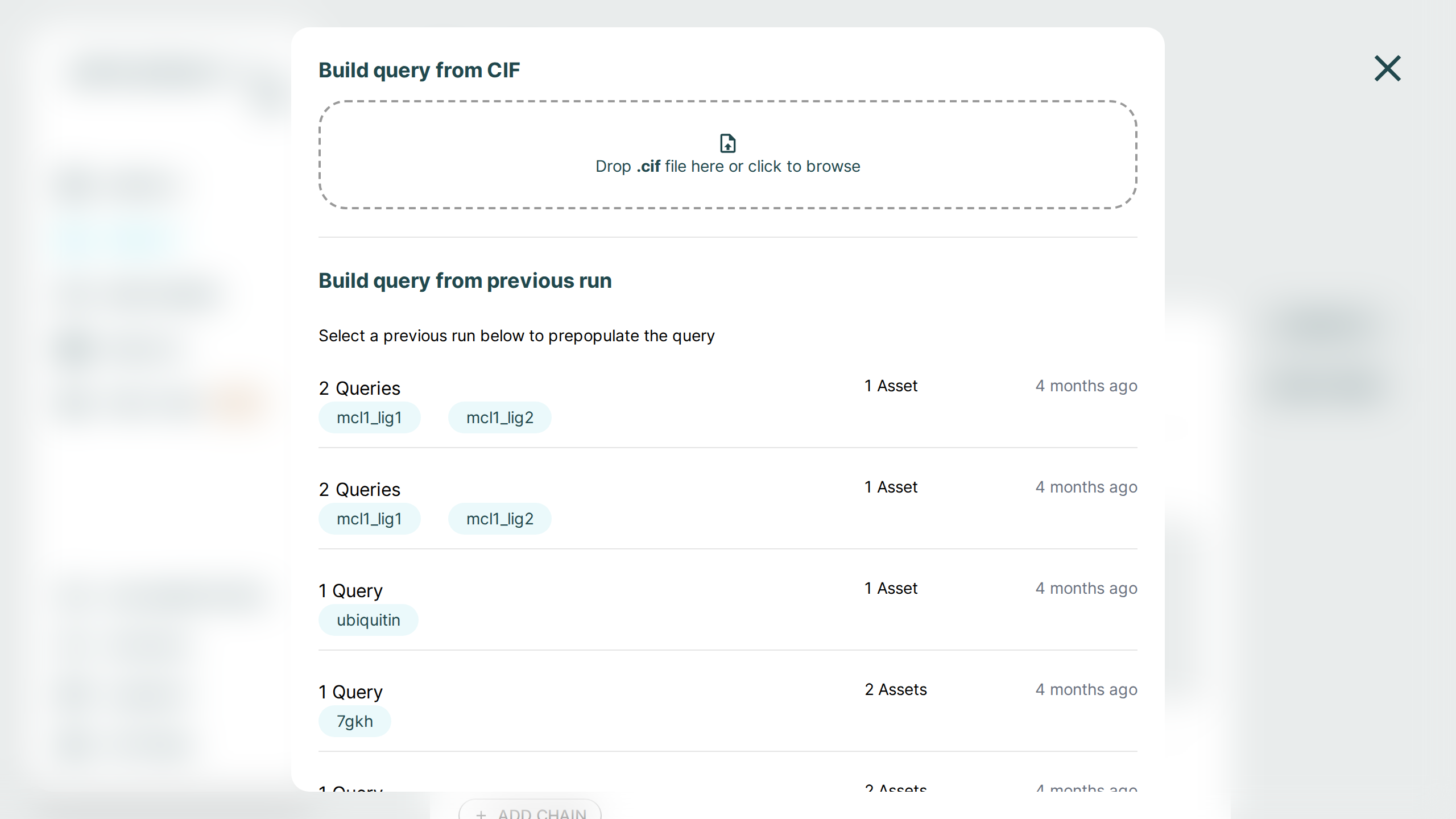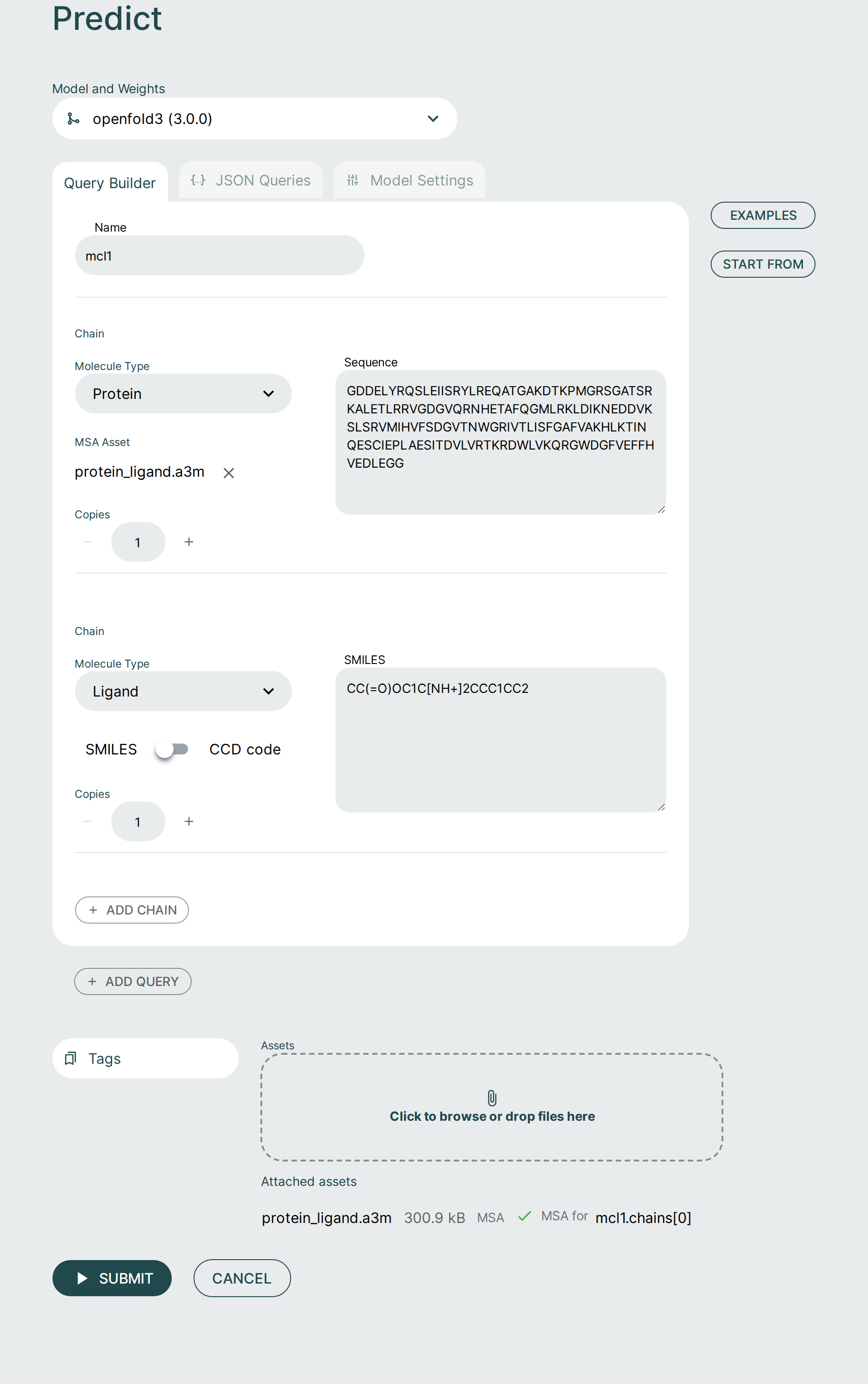 - Multi-Protein Ligand: A single query consisting of multiple sub-queries. In this case, MCL1 is co-folded with two different ligands (Aceclidine and 1-benzothiophene-2-carboxylic acid).