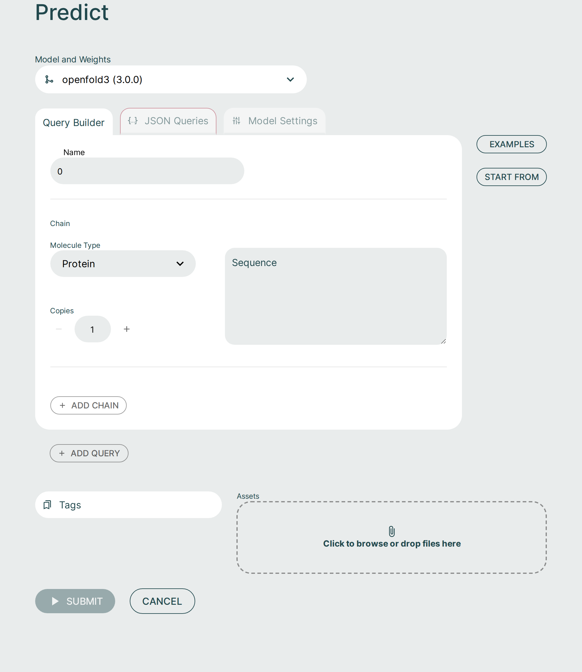 Use the Examples button to load one of the built-in sample queries, or use Start From to initialize a new prediction from either a CIF structure file or from a previous run.